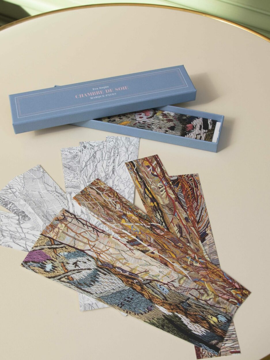 « Chambre de soie » par Eva Jospin. La plasticienne Eva Jospin s’est replongée dans ses gigantesques panneaux brodés pour sélectionner douze pans pour composer cet ensemble de marque-pages enchanteur. Branches, lianes, motifs végétaux aux 400 nuances colorées sur une face et au trait à l’encre noir sur l’autre face viendront se glisser entre les pages de vos livres. Retrouvez également une reproduction d’une photo d’Eva Jospin, imprimée sur du papier offset blanc 65 g/m².