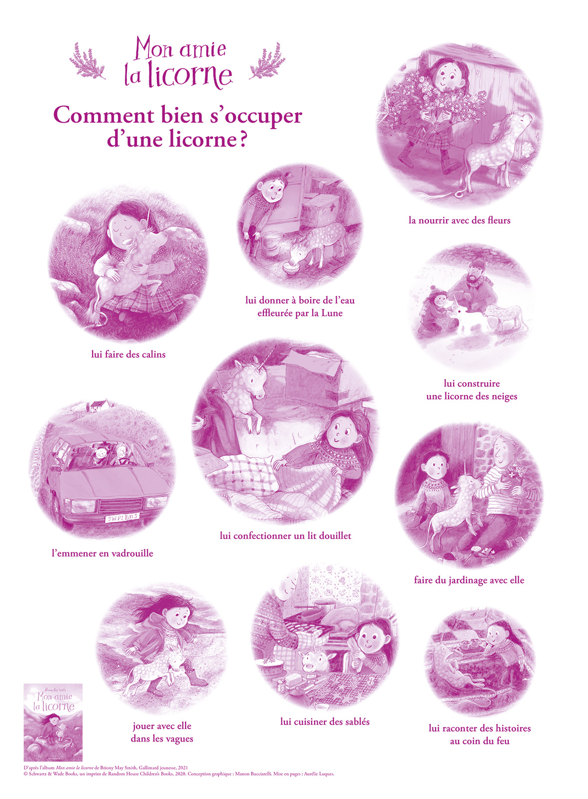 L’univers tendre et délicat de l’album phénomène Mon amie la licorne dans un puzzle grand format. Au verso du poster, des scènes marquantes de l’album pour montrer comment bien s’occuper d’une licorne.