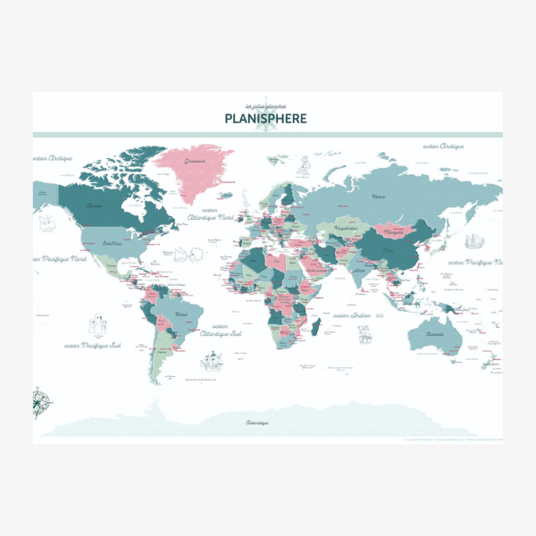 Mis à jour aux dernières données géopolitiques, pays et capitales, ce planisphère aux couleurs pastel et illustrations uniques s’intègre partout, à la maison ou au bureau. Derrière sa touche vintage déco, cette carte du monde favorise l’apprentissage comme nombre de nos planches déco pour les plus jeunes qui auront plaisir à flâner devant pour mémoriser leurs leçons !