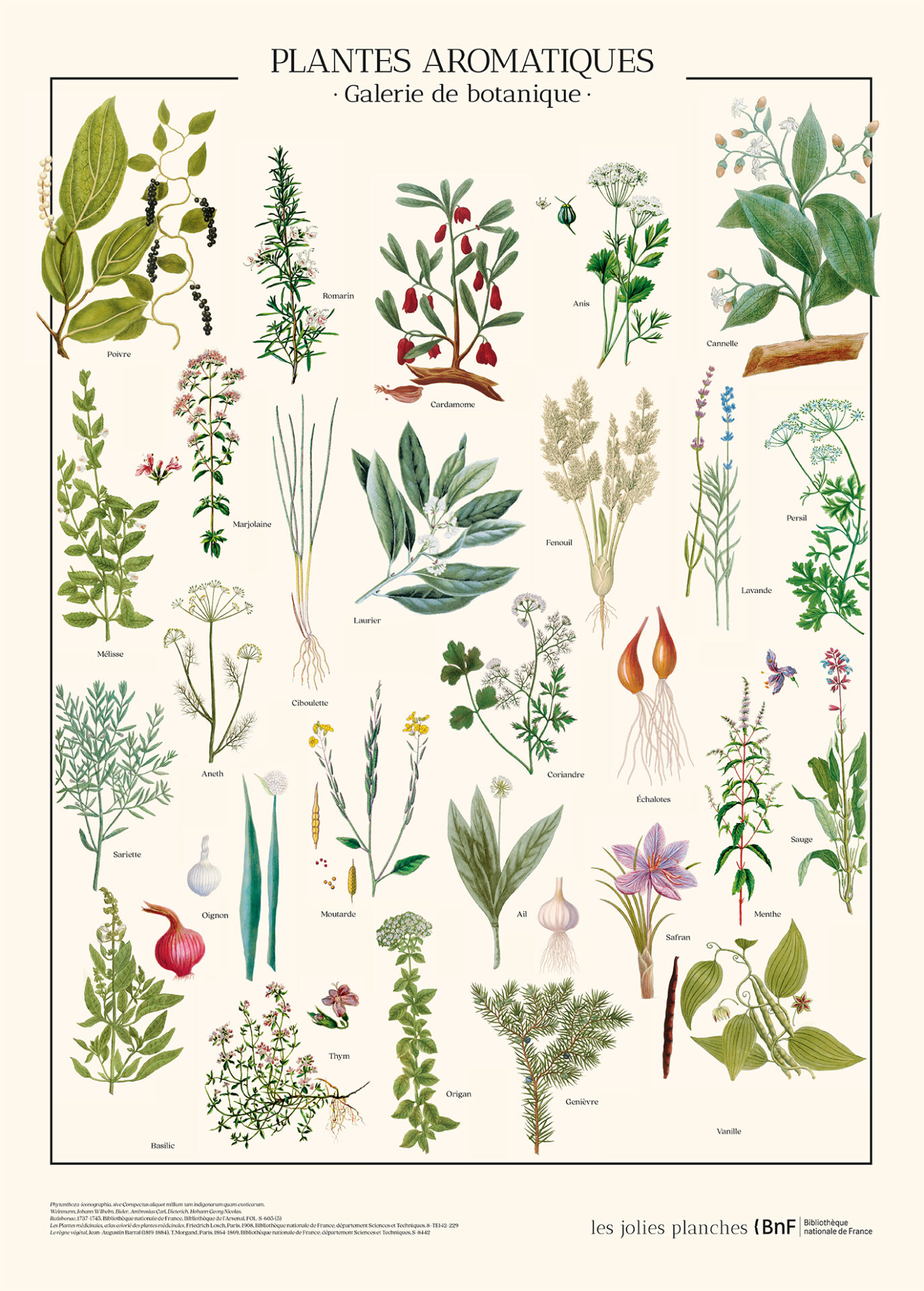 Notre planche “Plantes aromatiques” donnera du goût – et des couleurs – à la déco des botanistes en herbe ! Chaque illustration, finement restituée sur toile, est issue d’un ouvrage de botanique référent du début du siècle.